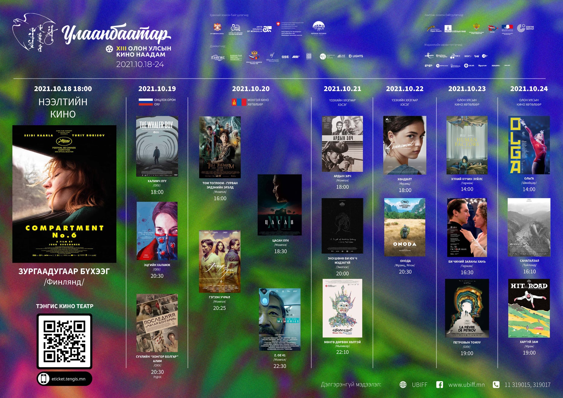 ЗУРАГТ ХУУДАСТАНИЛЦУУЛГА Дээрх зурган дээр дарж томруулан үзнэ үү! Кино наадмын кинонууд Ардын элчМонгол - 80’ (1959 он) Найруулагч: МУУГЗ Д.Жигжид 2021.10.21 18:00 ХАРГУЙ ЗАМИран - 93’ (2021 он) Найруулагч: Пана Панахи 2021.10.24 19:00 ЦАСАН ХҮНМонгол - 84’ (2021 он) Найруулагч: Б.Батбаатар 2021.10.20 18:30 ХӨНДӨЛТФранц - 100’ (2021 он) Найруулагч: Одри Дивон 2021.10.22 18:00 ЗУРГАДУГААР БҮХЭЭГФинлянд - 106’ (2021 он) Найруулагч: Юухо Куосманен 2021.10.18 18:00 ТОМ ТОГЛООМ - ГУРВАН ЭРДЭНИЙН ЭРЭЛДМонгол - 88’ (2021 он) Найруулагч: Д.Болорцэцэг 2021.10.20 16:00 ПЕТРОВЫН ТОМУУОХУ - 145’ (2020 он) Найруулагч: Кирилл Серебренников 2021.10.23 19:00 ОНОДАФранц | Япон - 165’ (2021 он) Найруулагч: Артур Харари 2021.10.22 20:30 ХҮНИЙ ХҮЧИН ЗҮЙЛСГерман - 102’ (2021 он) Найруулагч: Ронни Трокер 2021.10.23 14:00 САНАГАЛЗАЛТайланд - 136’ (2020 он) Найруулагч: Апичатпонг Веерасетакул 2021.10.24 16:10 МӨНГӨ ДӨРВӨН ХӨЛТЭЙМьянмар - 98’ (2020 он) Найруулагч: Маун Сан 2021.10.21 22:10 БИ ЧИНИЙ ЗАЯАНЫ ХАНЬГерман - 108’ (2021 он) Найруулагч: Мария Шрейдер 2021.10.23 16:30 ОЛЬГАШвейцар - 85’ (2021 он) Найруулагч: Эли Грэпп 2021.10.24 14:00 ЭНЭ ШӨНӨ БИ ЮУ Ч МЭДЭХГҮЙЭнэтхэг | Франц - 96' (2021 он) Найруулагч: Паял Кападия 2021.10.21 20:00 ГЭГЭЭН УЧРАЛМонгол - 80’ (2020 он) Найруулагч: Б.Буянбат 2021.10.20 20:25 Z.OE 41Монгол - 45’ (2020 он) Найруулагч: Б.Энхтулга, Б.Oюунбаатар 2021.10.20 22:30 3. СҮҮЛЧИЙН ХОНГОРХОН БОЛГАРИЯОХУ - 109’ (2021 он) Найруулагч: Алексей Федорченко 2021.10.19 19:00 @РНЦК ХАЛИМЧ ХҮҮОХУ - 93’ (2021 он) Найруулагч: Филипп Юрьев 2021.10.19 18:00 ЭЦГИЙН ХАЛАМЖОХУ - 97’ (2021 он) Найруулагч: Кира Коваленко 2021.10.19 20:30 КИНО НААДМЫН ХӨТӨЛБӨР ВИДЕО ТАНИЛЦУУЛГА https://www.youtube.com/watch?v=trXoUTY60zs&t=5s https://www.youtube.com/watch?v=PSS6e2yD8_o&t=46s