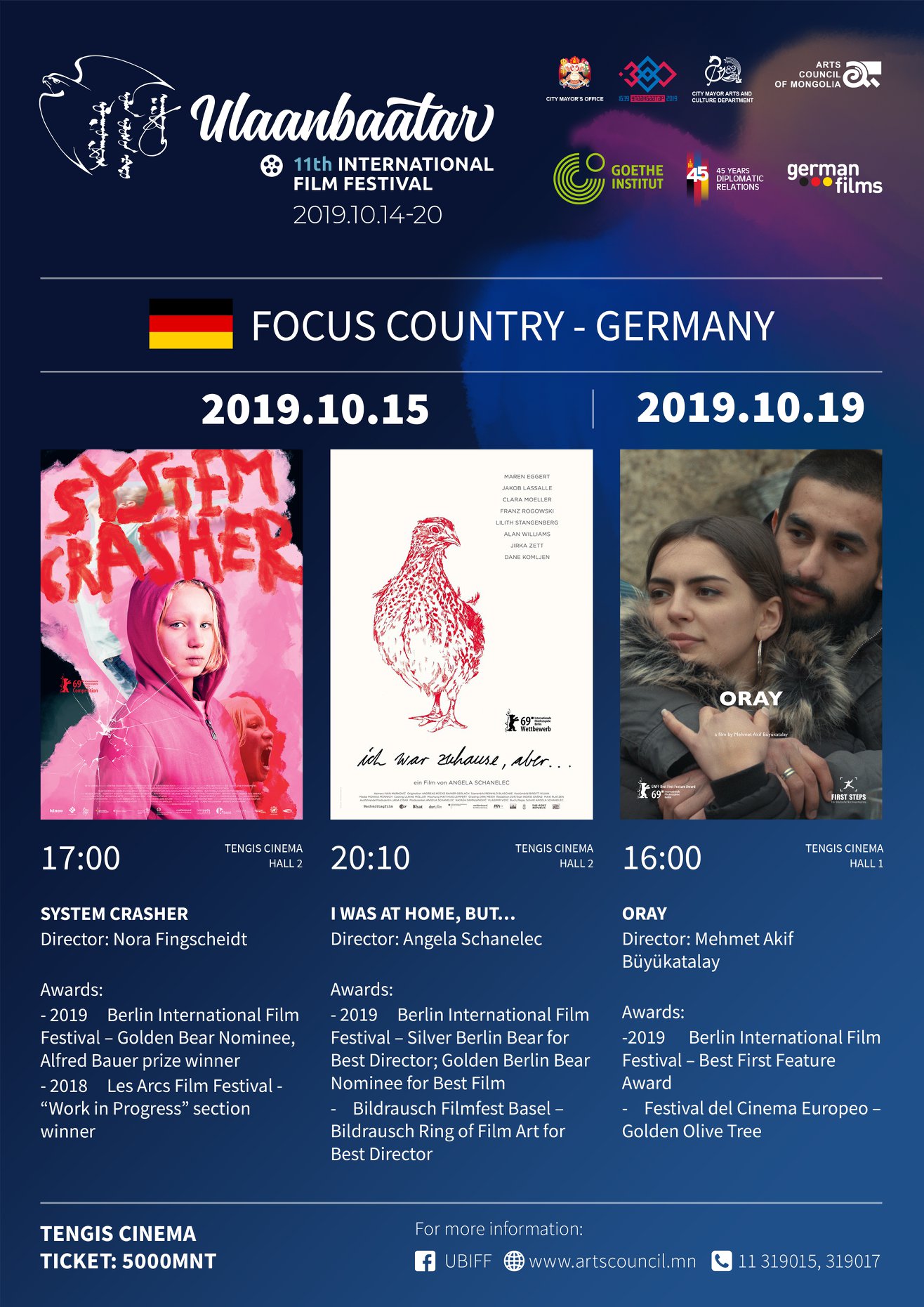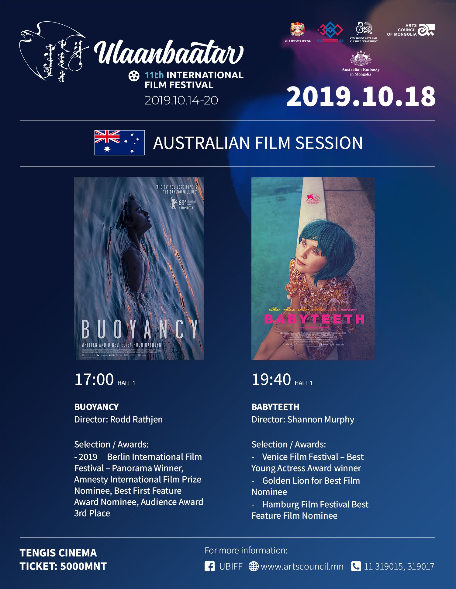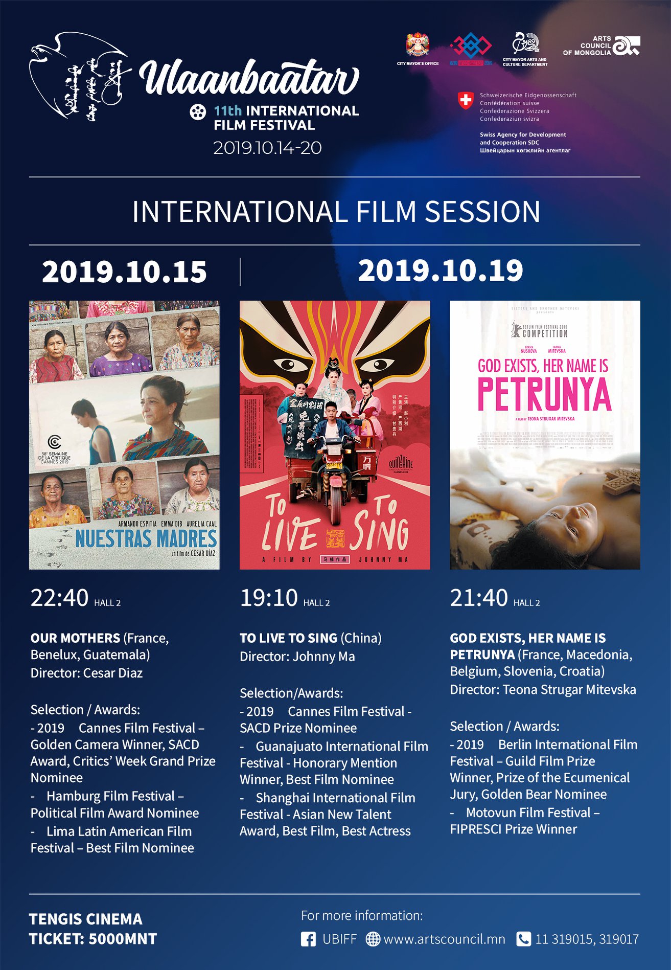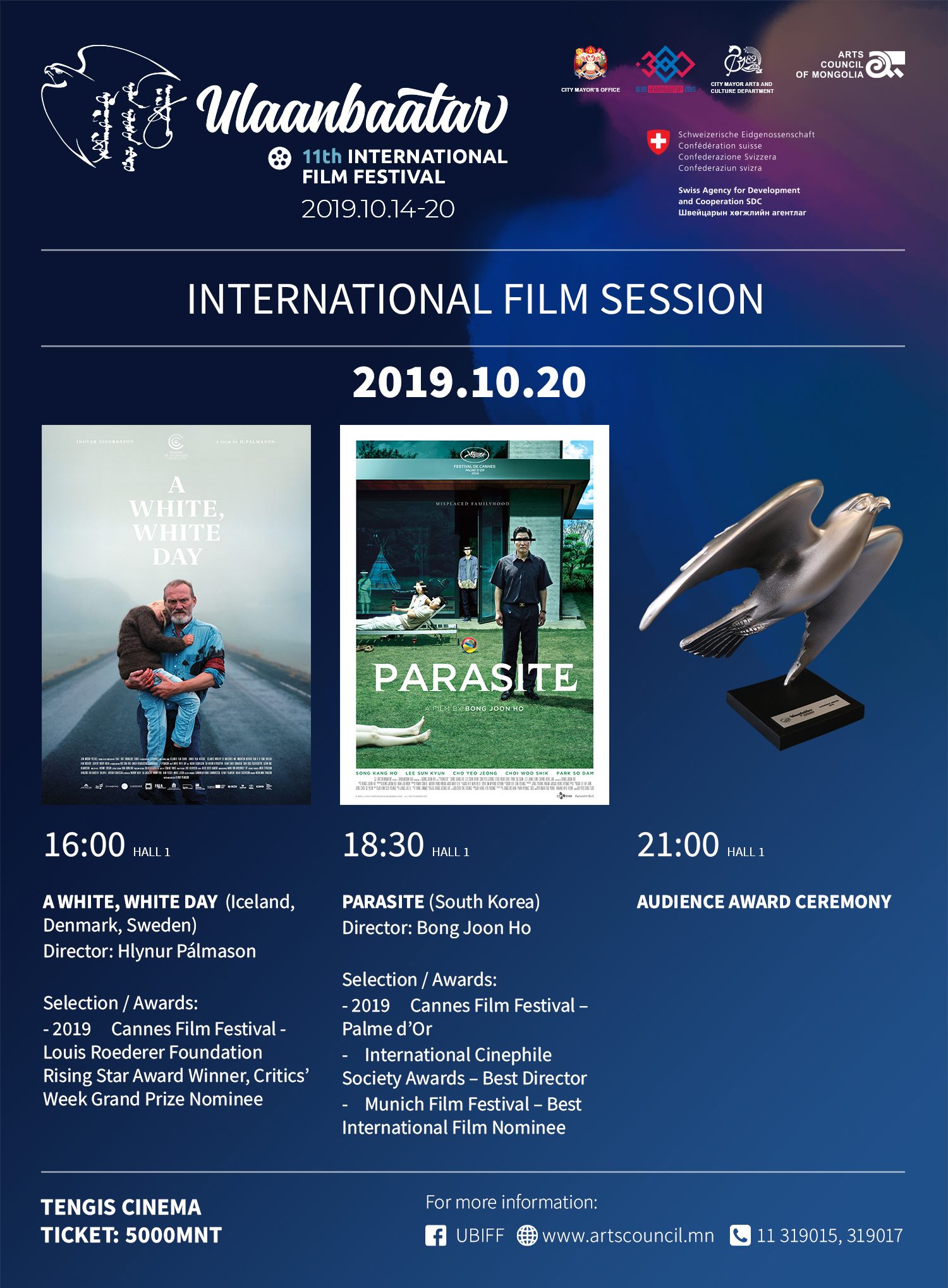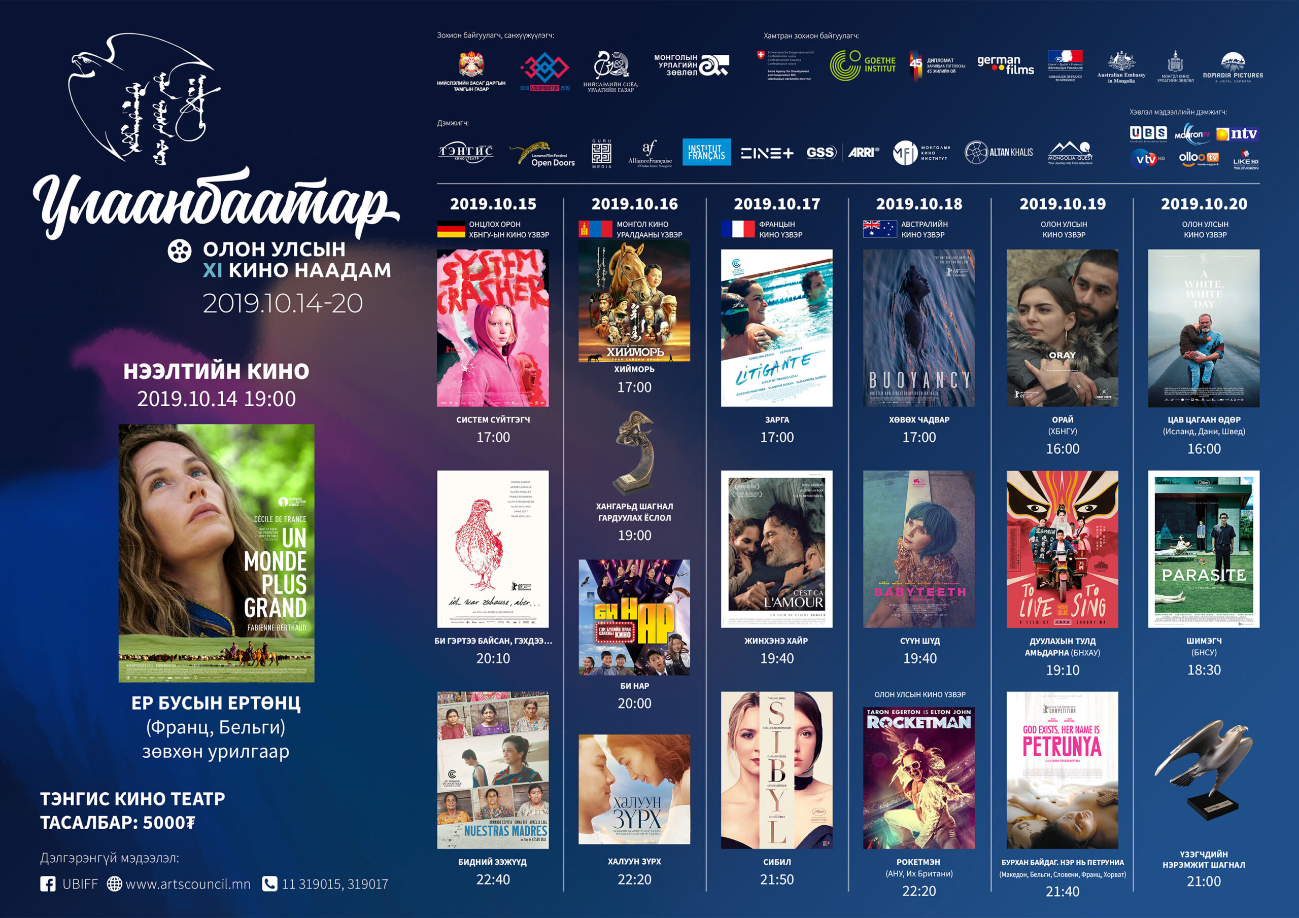 POSTERBROCHURE To view brochure click on the image! MOVIES A BIGGER WORLDFrance | Belgium - 109' (Drama - 2019) Director: Fabienne Berthaud A WHITE, WHITE DAYIceland | Denmark | Sweden - 109' (Drama -2019) Director: Hlynur Pálmason BABYTEETHAustralia - 118' (Comedy, Drama, Music -2019) Director: Shannon Murphy BUOYANCYAustralia - 93' (Crime, Drama - 2019) Director: Rodd Rathjen GOD EXISTS, HER NAME IS PETRUNYARepublic of North Macedonia | Belgium | France | Croatia | Slovenia - 100' (Drama - 2019) Director: Teona Strugar Mitevska HEARTMongolian - 100' (Drama - 2019) Director: Gantsetseg Dorjgotov I AM, THE SUNMongolia - 108' (Family - 2019) Director: Janchivdorj Sengedorj I WAS AT HOME, BUT...Germany | Serbia - 105' (Drama - 2019) Director: Angela Schanelec LITIGANTEColombia | France - 93' (Drama - 2019) Director: Franco Lolli ORAYGermany - 100' (Drama - 2019) Director: Mehmet Akif Büyükatalay OUR MOTHERSGuatemala | Belgium | France - 78' (Drama - 2019) Director: Cesar Diaz PARASITE South Korea - 132' (Comedy, Drama, Thriller - 2019) Director: Bong Joon Ho REAL LOVE France | Belgium - 98' (Comedy, Drama - 2019) Director: Claire Burger ROCKETMANUK | USA | Canada - 121' (Biography, Drama, Music - 2019) Director: Dexter Fletcher SIBYLFrance | Belgium - 100' (Drama - 2019) Director: Justine Triet SYSTEM CRASHERGermany - 125' (Drama - 2019) Director: Nora Fingscheidt THE STEEDMongolia - 110' (Action, Adventure, Family - 2019) Director: Erdenebileg Ganbold TO LIVE TO SINGChina - 105' (Drama - 2019) Director: Johnny Ma MOVIE FESTIVAL PROGRAMVIDEO
